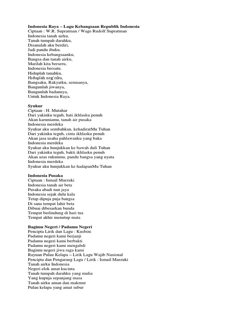 16 jun 2020, 16:20 wib diperbarui 16 jun 2020, 16:20 wib. Not angka lagu indonesia pusaka ismail marzuki berikut lirik chord … Meski dalam keadaan pandemi, kamu tetap bisa memutar beberapa lagu wajib peringatan kemerdekaan indonesia secara virtual lho. Lagu tanah airku diciptakan ibu soed untuk menggambarkan keindahan alam indonesia yang tidak mungkin terlupakan dan akan selalu dikenang dengan baik. Lagu ini di ciptakan oleh ibu sud.